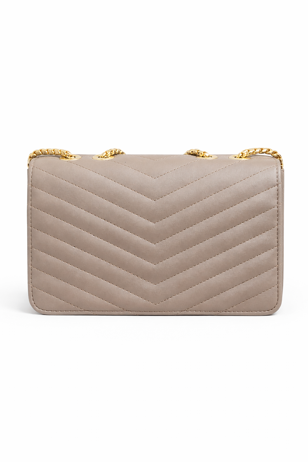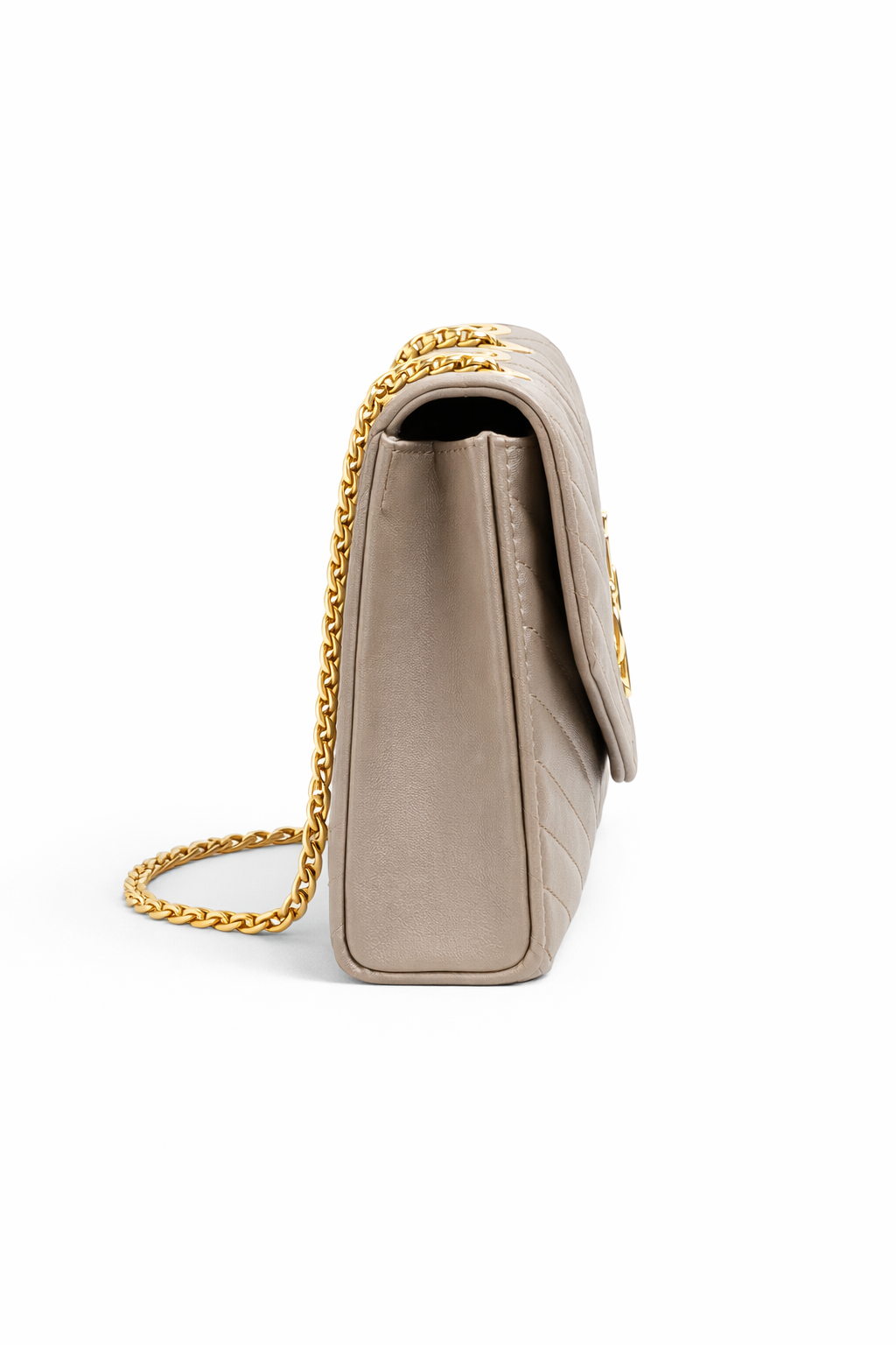 Modern ve şık tasarımıyla öne çıkan bu kapitone çanta, günlük ve özel kombinleriniz için zarif bir tamamlayıcıdır. Chevron dikiş detayları ve gold metal logo aksesuarı çantaya lüks bir görünüm kazandırır. Ayarlanabilir zincir askısı sayesinde omuzda ve çapraz kullanım imkanı sunar.