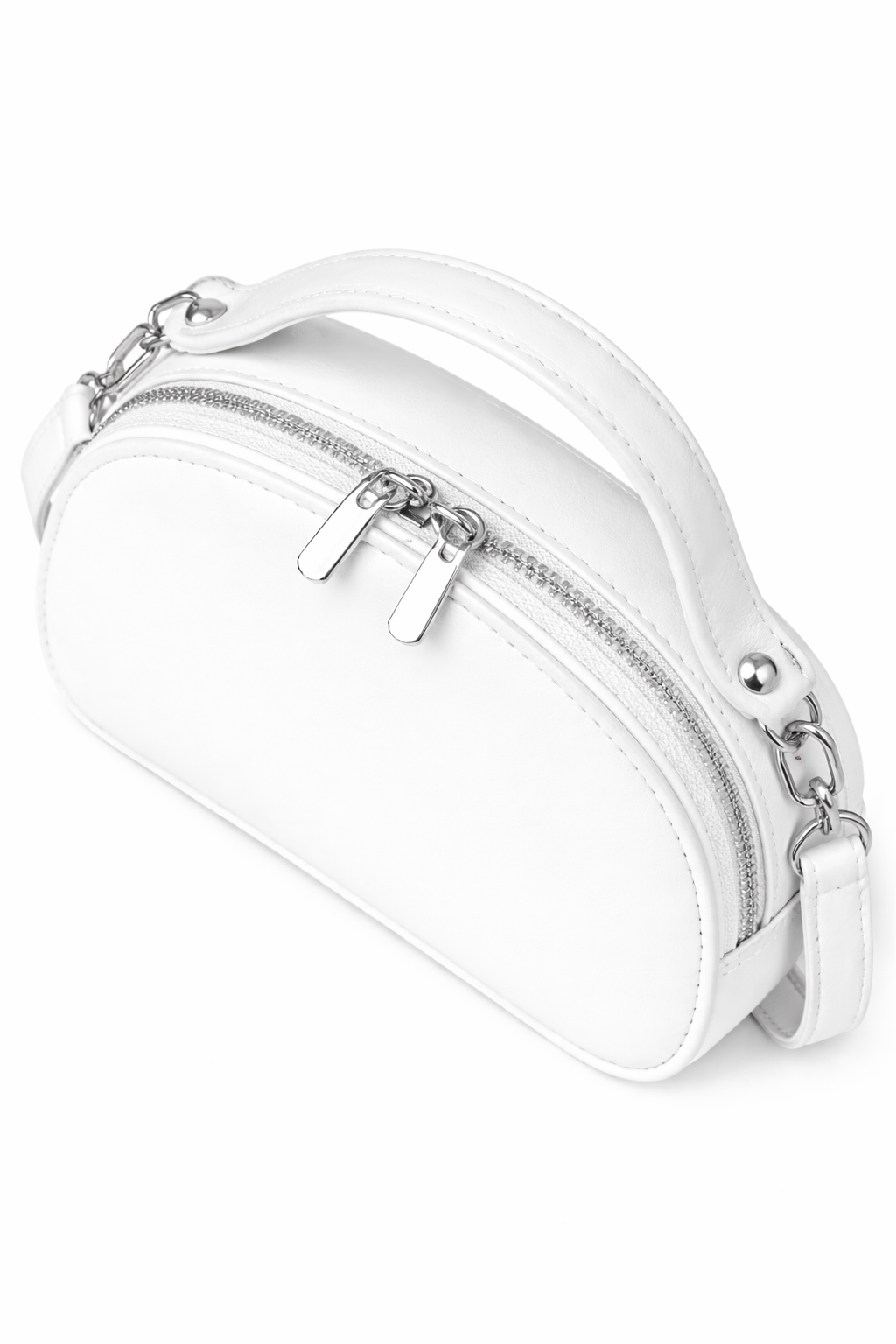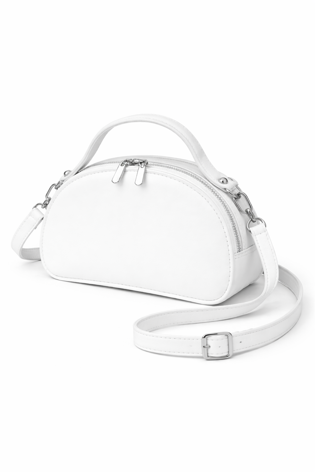 Şık ve minimal tasarımıyla öne çıkan bu yarım ay form mini çanta, günlük kombinleriniz için zarif bir tamamlayıcıdır. Ön ve arka yüzü sade ve düz tasarıma sahip olup iki fermuarlı yapısı sayesinde eşyalarınızı düzenli şekilde taşımanızı sağlar. Üst sap detayı ile elde kullanım imkanı sunarken, kompakt boyutu ile hem pratik hem şık bir kullanım sağlar.