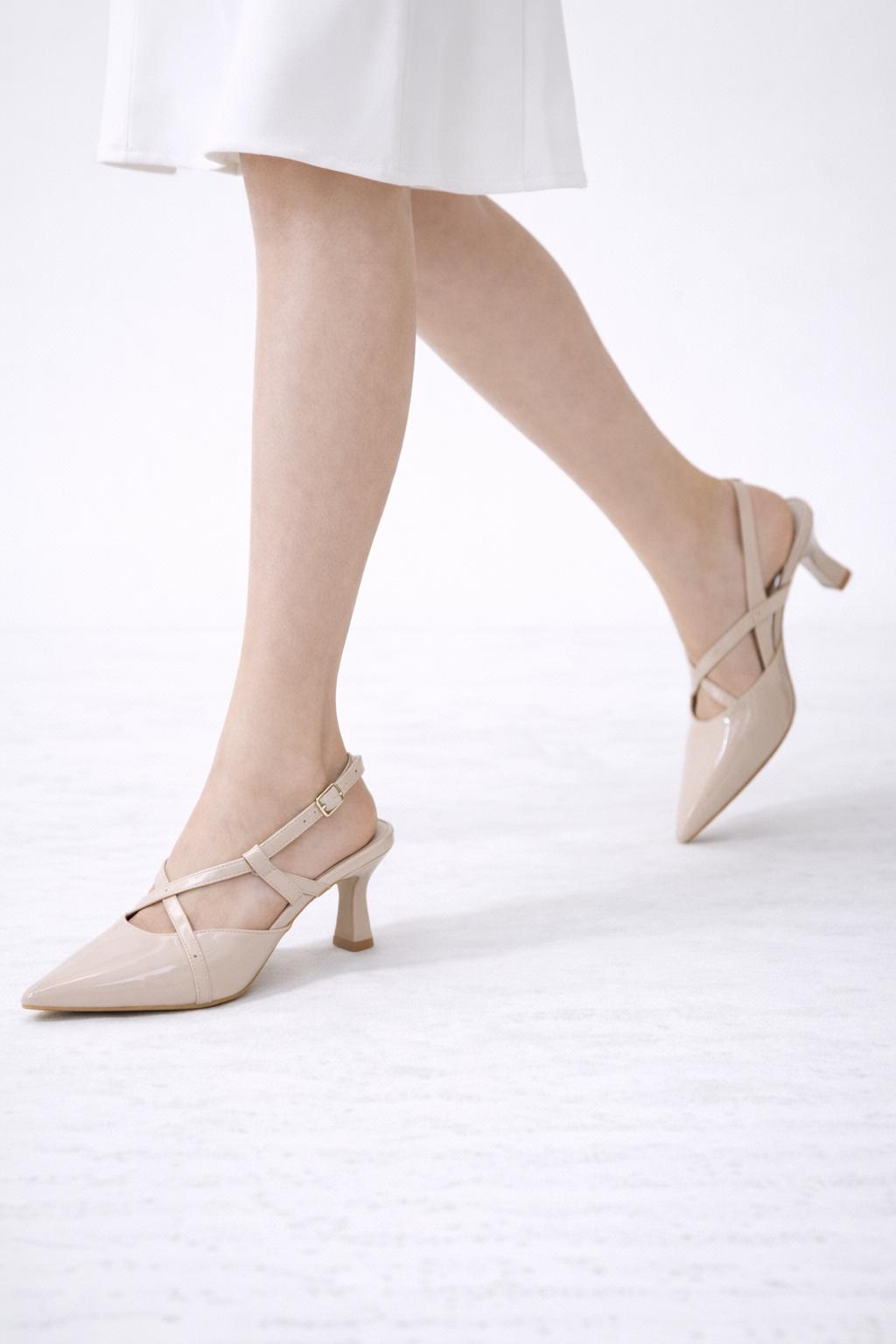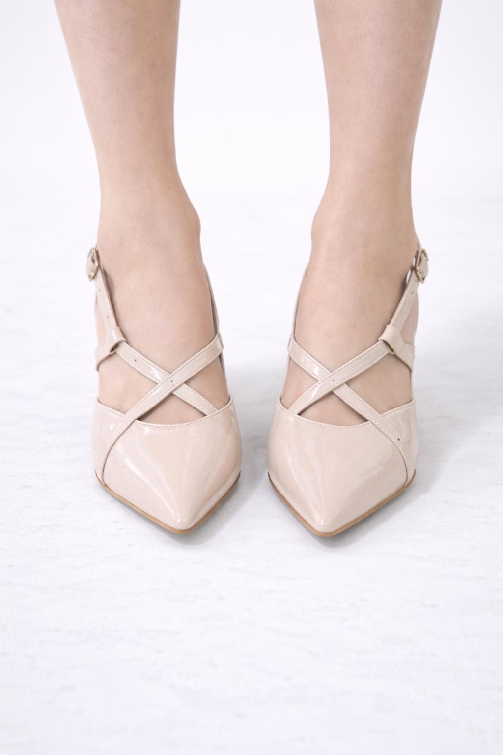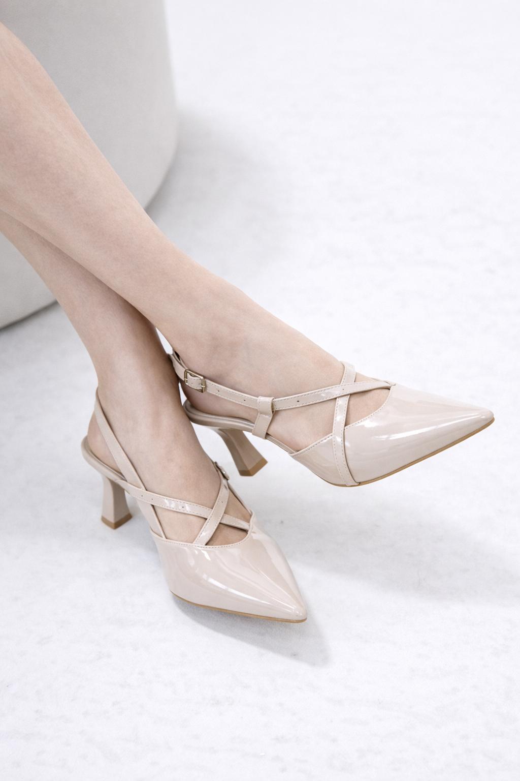 Parlak rugan yüzeyi ve çapraz bant detaylarıyla zarif bir görünüm sunar. Ayarlanabilir toka ve orta boy topuğu sayesinde hem şık hem konforlu kullanım sağlar. Ofis ve özel gün kombinleri için ideal, zamansız bir nude slingback model.