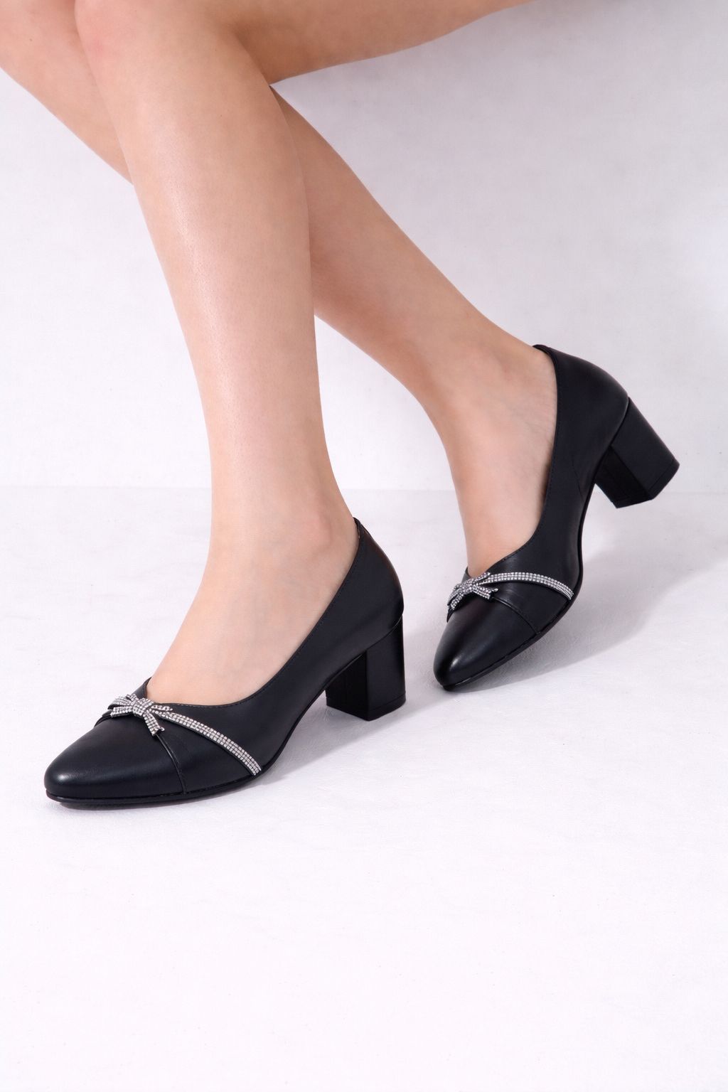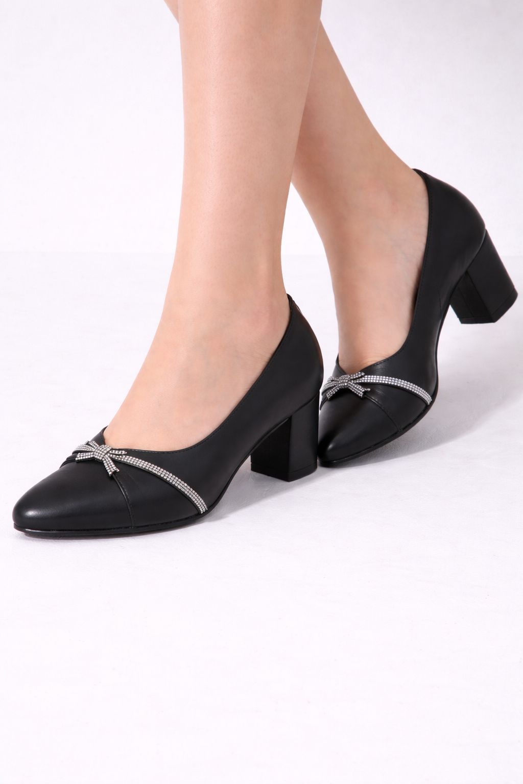 Kristal taşlı fiyonk detayıyla zarif ve şık bir görünüm sunan siyah klasik topuklu ayakkabı. Kalın blok topuğu sayesinde dengeli ve konforlu kullanım sağlar. Günlük şıklık ve özel kombinler için ideal.