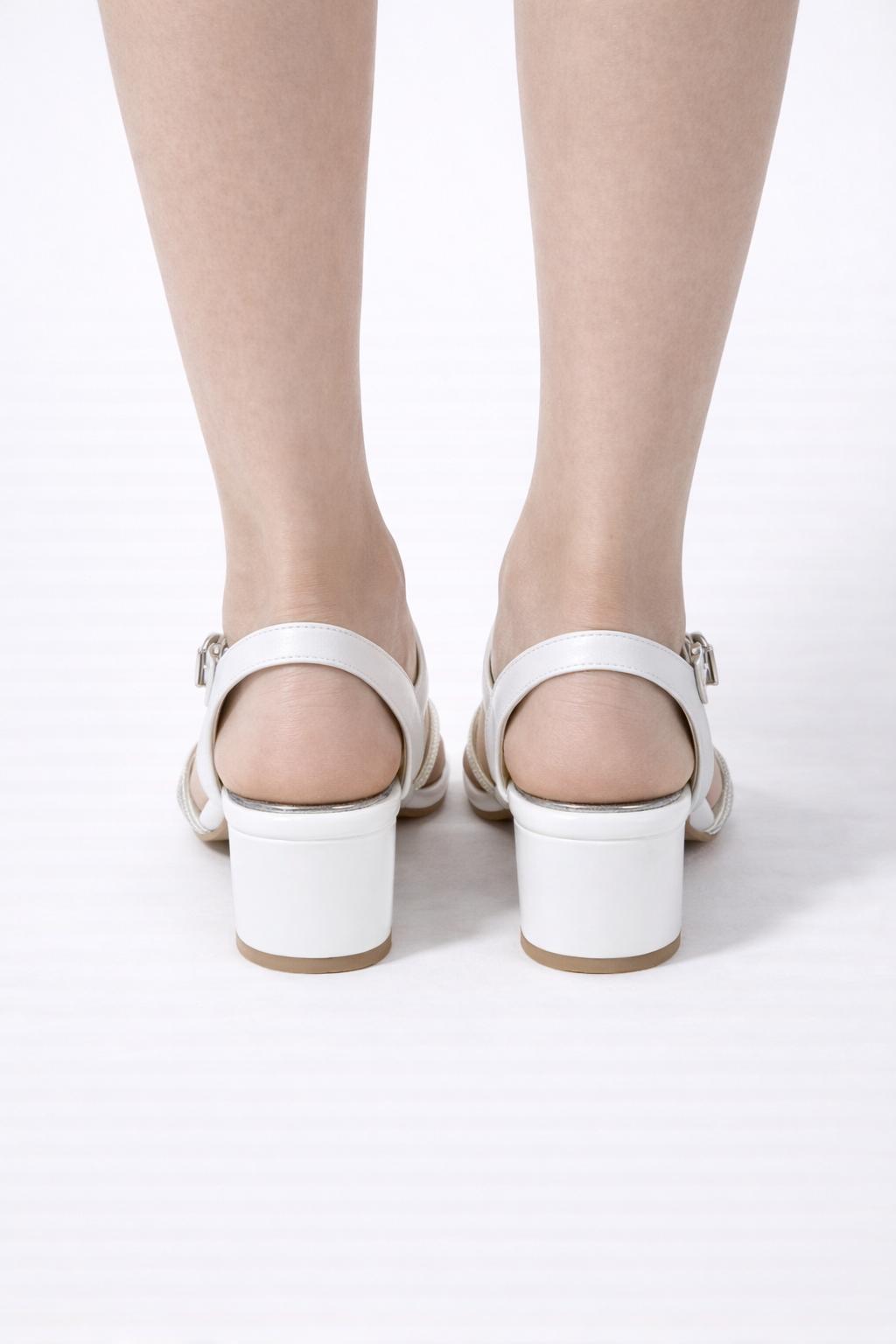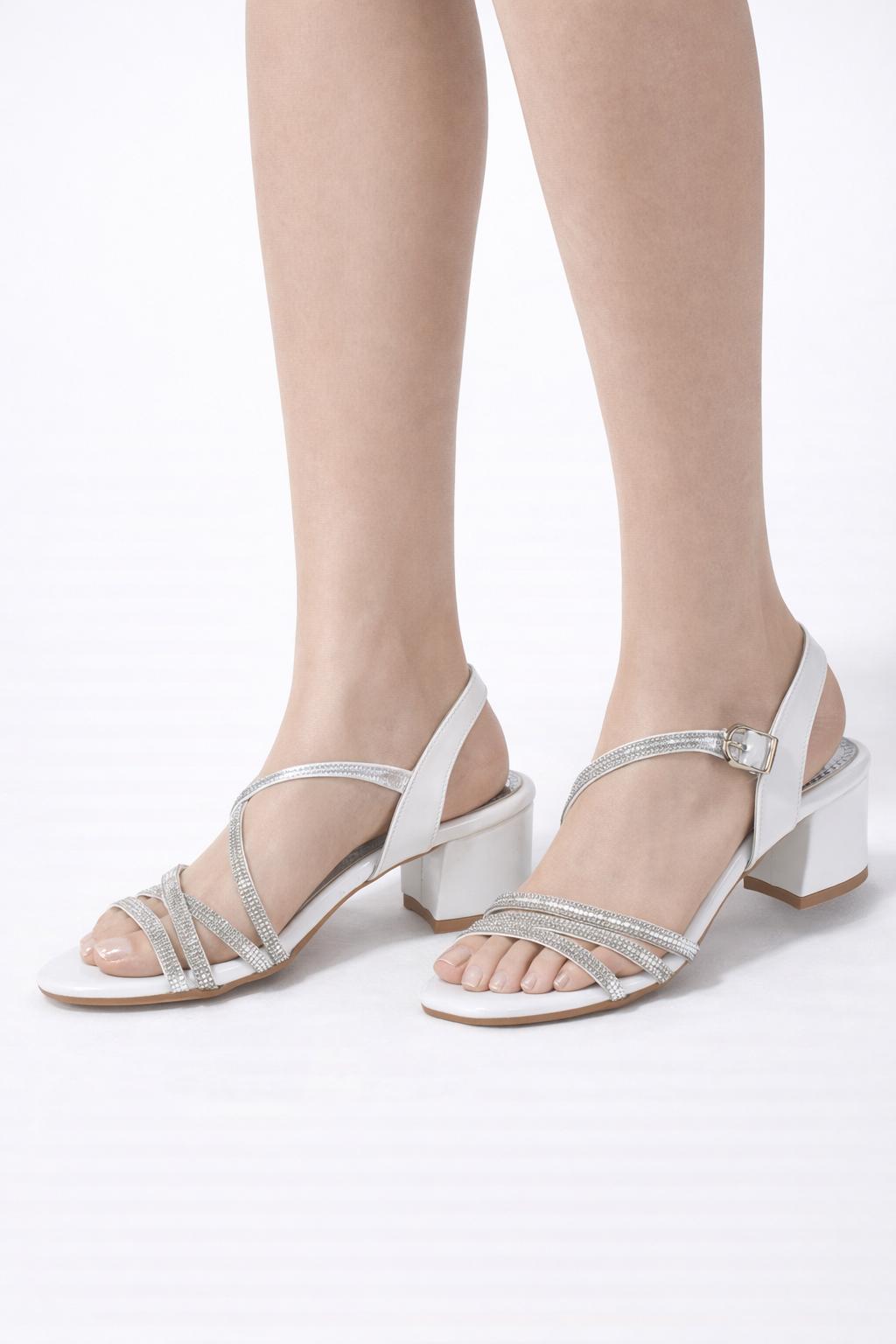 Zarif tasarımı ve ışıltılı detaylarıyla öne çıkan bu beyaz taşlı blok topuk sandalet, özel gün kombinlerinin vazgeçilmez tamamlayıcısıdır. Ön kısmında yer alan ince ve kristal taş işlemeli şeritler ayağa zarif bir görünüm kazandırırken, ışığı yansıtan yapısıyla şıklığınızı ön plana çıkarır.