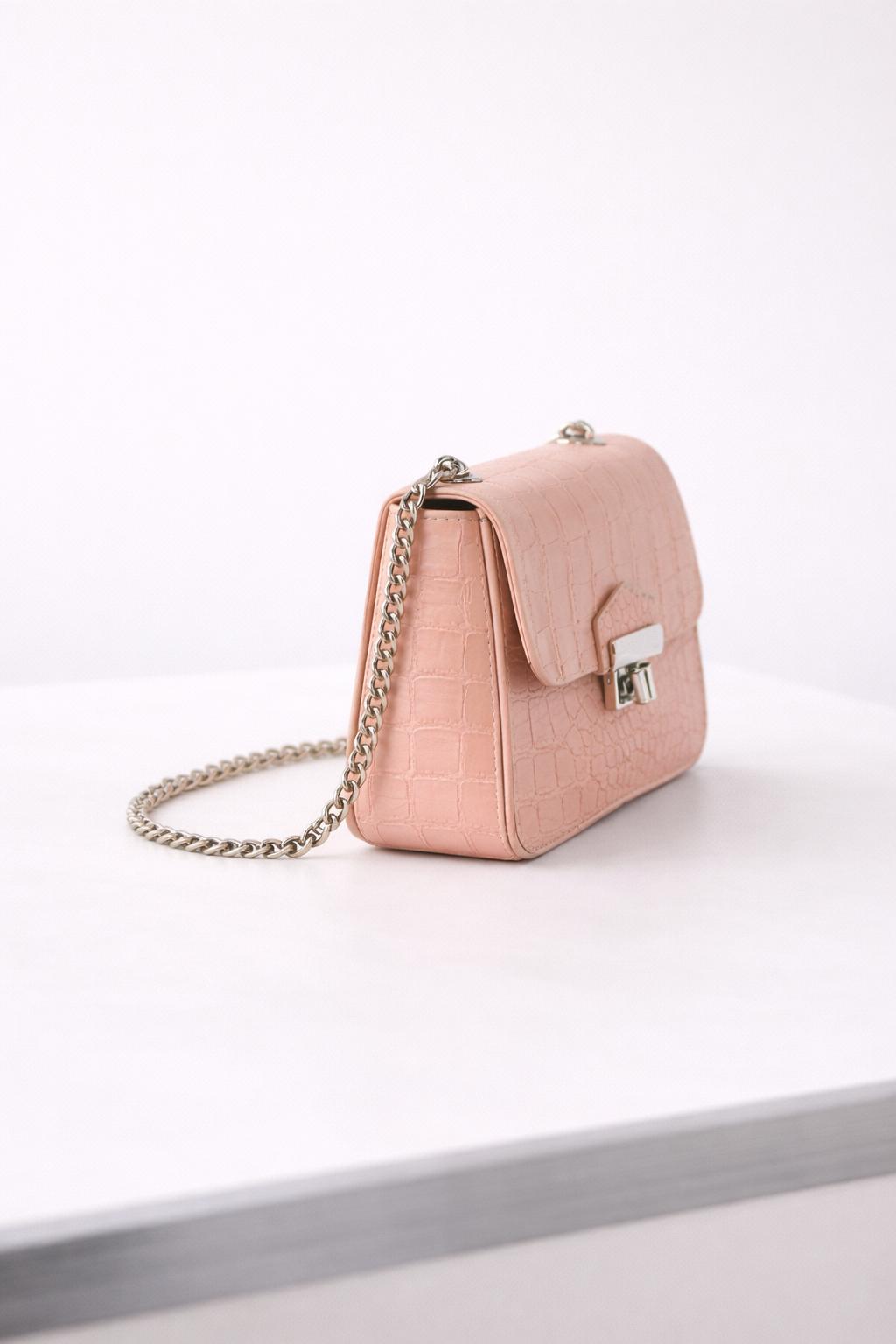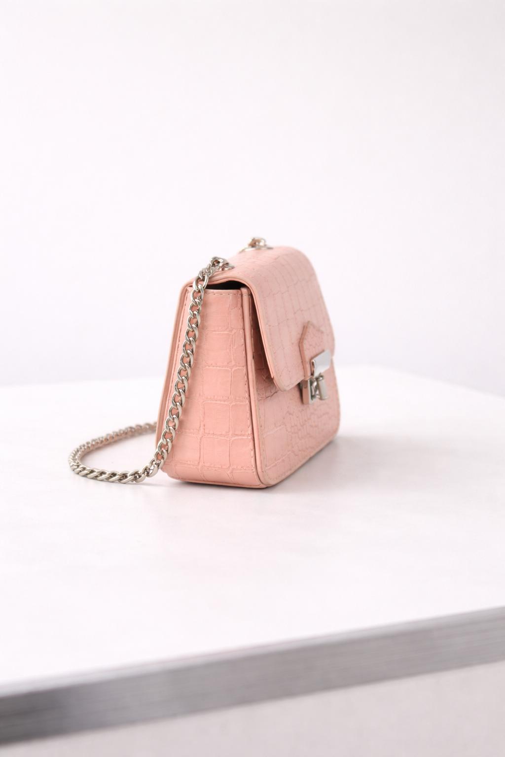Pudra pembe krokodil desenli, metal kilit detaylı şık mini çanta. Zincir askısı ve kompakt yapısıyla hem günlük hem özel kombinlere zarif bir dokunuş katar.