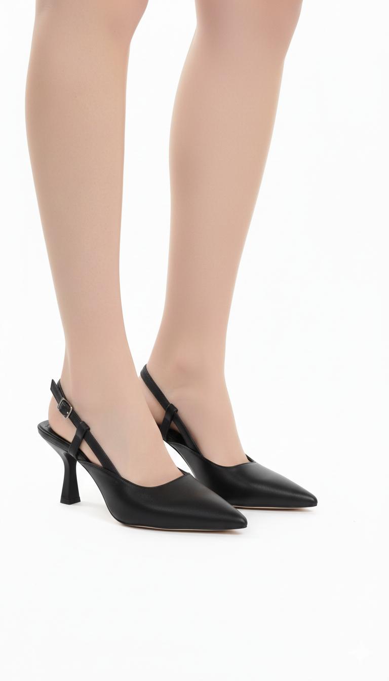 Siyah Deri Sivri Burun Tokalı Slingback Topuklu Ayakkabı